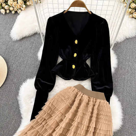 Fashion suit for women V-neck lantern sleeves velvet top two-piece set S4260