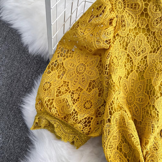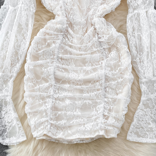New Square Neck Flare Long Sleeve Lace Dress for Women S4270