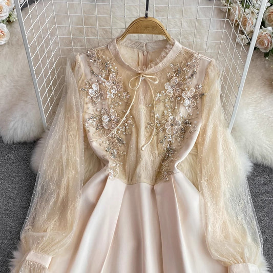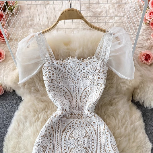puff sleeves round neck A-line lace dress elegant long skirt S4262