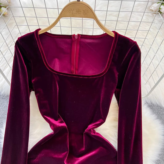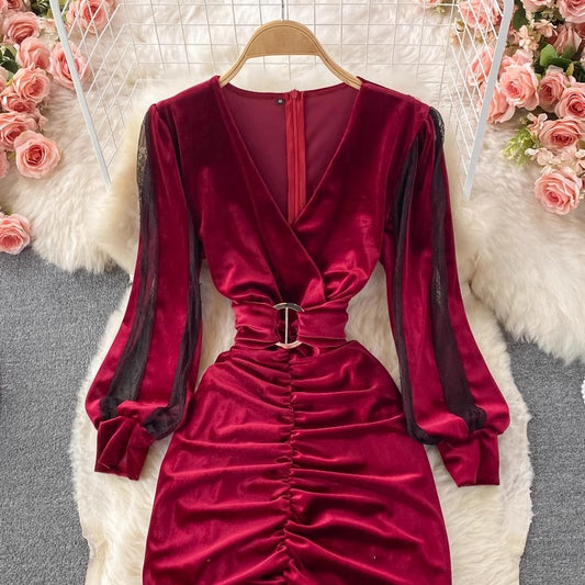 Sexy V-neck Pleated Mesh Velvet Slit Dress S4255