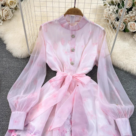 Fashionable long-sleeved V-neck A-line printed dress S4215