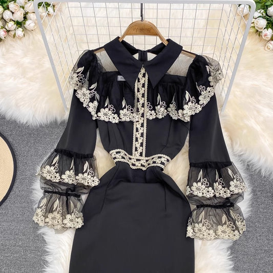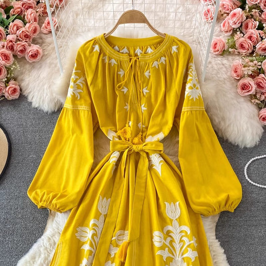 embroidered round neck lantern sleeve long dress bohemian dress for women S4221
