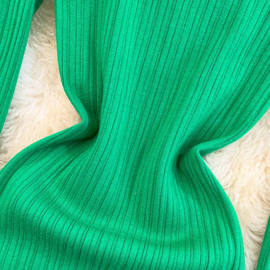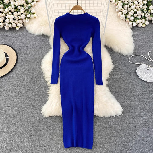 long-sleeved round neck elastic tight mid-length knitted dress S4010
