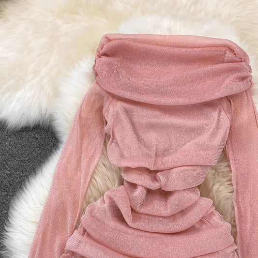 hot girl off-shoulder long-sleeved pleated dress for women S4013
