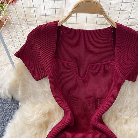 Tight square-neck knitted dress short-sleeved new style sexy long skirt S4027