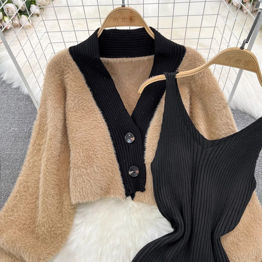 long-sleeved V-neck sweater short coat two-piece set V-neck knitted for women S4018