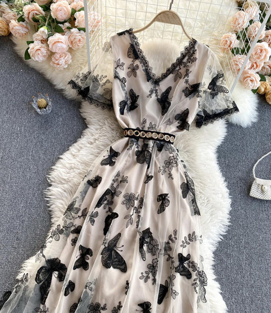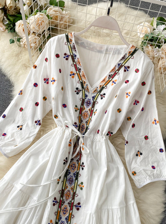 A line v neck embroidery long sleeve dress S70