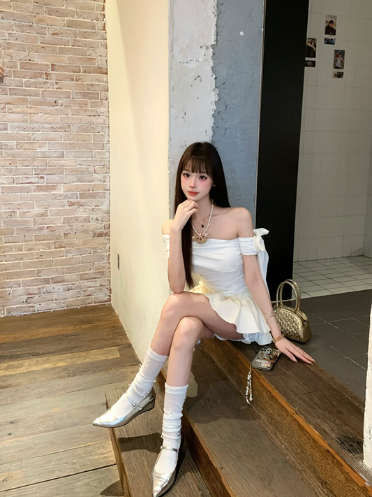 Butterfly print neckline waist A-line suspender dress summer French temperament slim skirt R5027