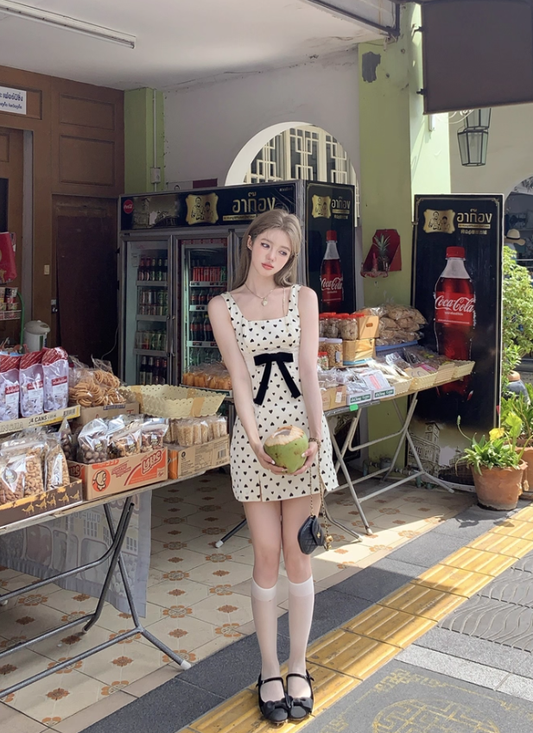 Square neck polka dot suspender dress women's summer French retro skirt R5028