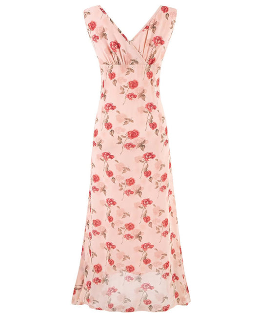 French retro pink printed dress 2025 new waist tea break long dress R2598