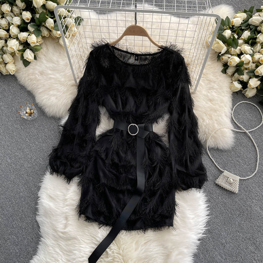 French dress with fur tassel design, small and chic temperament A-line short skirt R2274
