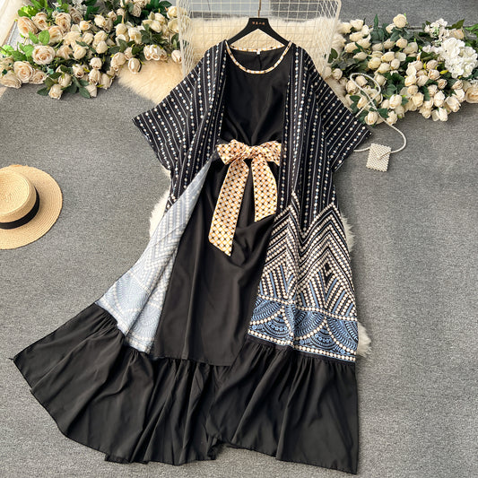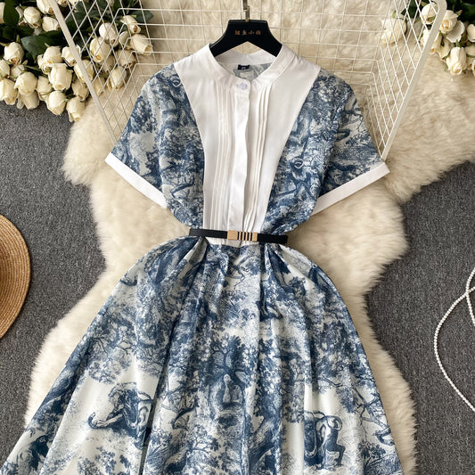 French palace style short-sleeved printed dress with waist and fairy temperament long dress R2241