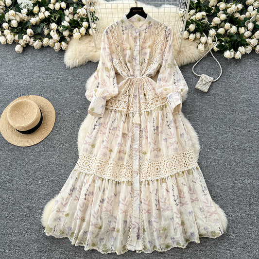 Palace style lace patchwork waist dress French slim print embroidered fairy long dress R2244