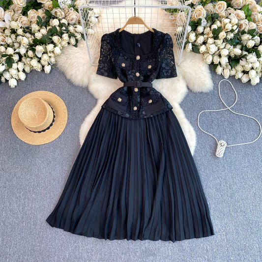 French Chanel style dress exquisite temperament square neck lace pleated long dress R2243