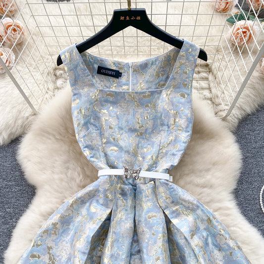 Palace style dress French square collar slim waist slimming gold stamping retro dress R2193