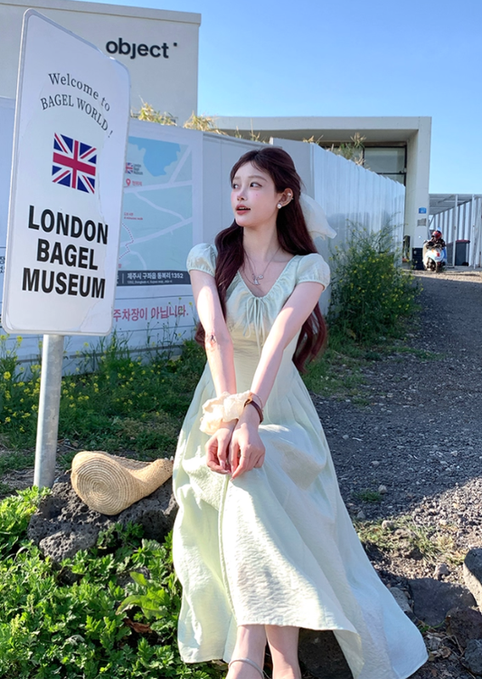 Yellow square neck puff sleeve waist dress summer French retro temperament skirt R4869
