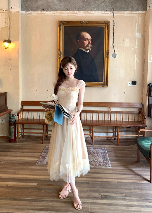Solid color long mesh square neck suspender dress summer French style temperament skirt R4871