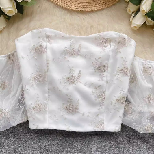 embroidered tube top for women off-shoulder short puff-sleeved chic top S4617