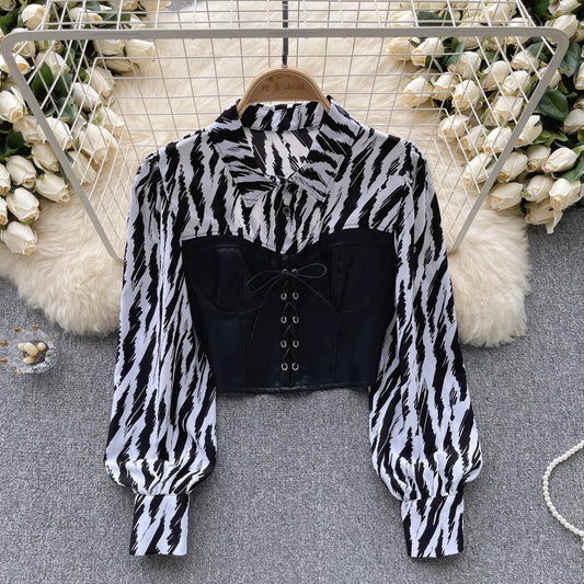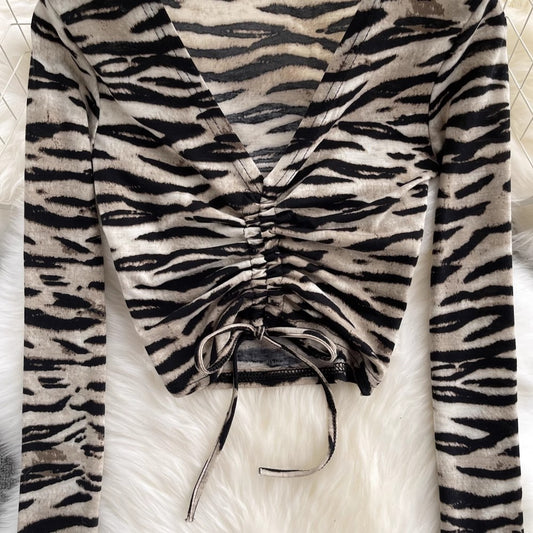 ins retro short top women's new leopard print V-neck pleated long-sleeved T-shirt S4568