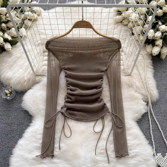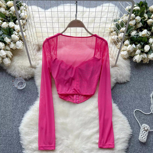 Sexy lace mesh long-sleeved T-shirt for women hot girl short top S4591