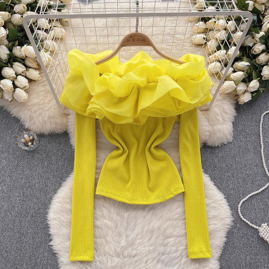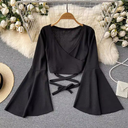 V-neck short bell sleeves sexy long-sleeved T-shirt women's chic tops S4589