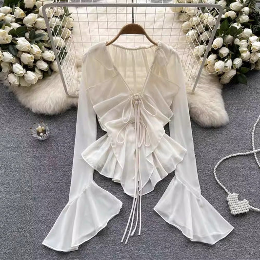 Designed irregular bell-sleeved chiffon shirt for women new style ruffled V-neck top trendy S4601
