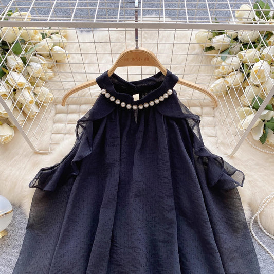chiffon top women's long-sleeved beaded halterneck shirt S4594