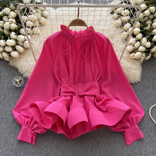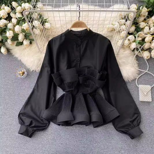 Designed irregular ruffled mesh shirt for women pleated chic top trendy S4498