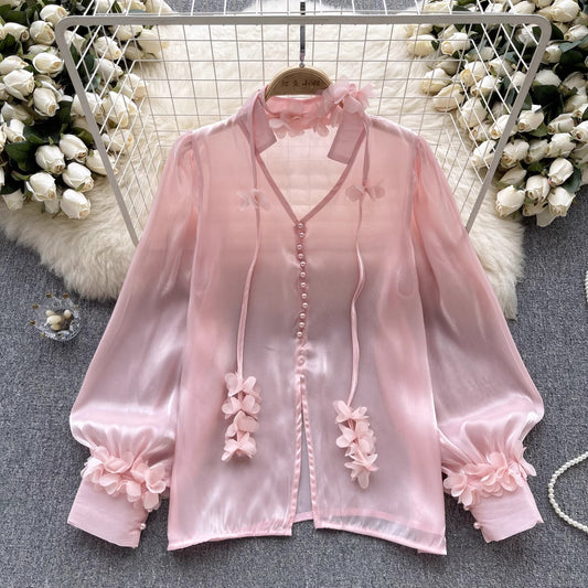 mesh shirt for women with ribbon long-sleeved design beautiful top trend S4532