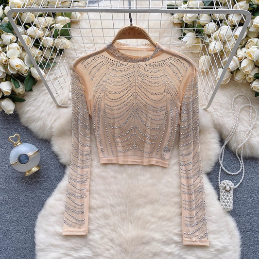 long-sleeved T-shirt women's diamond mesh design top S4496