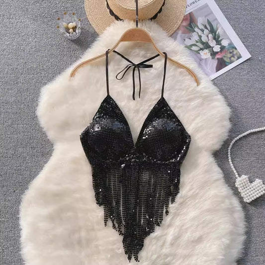 summer sexy design sequined halter top women's short tassel tube top S4488