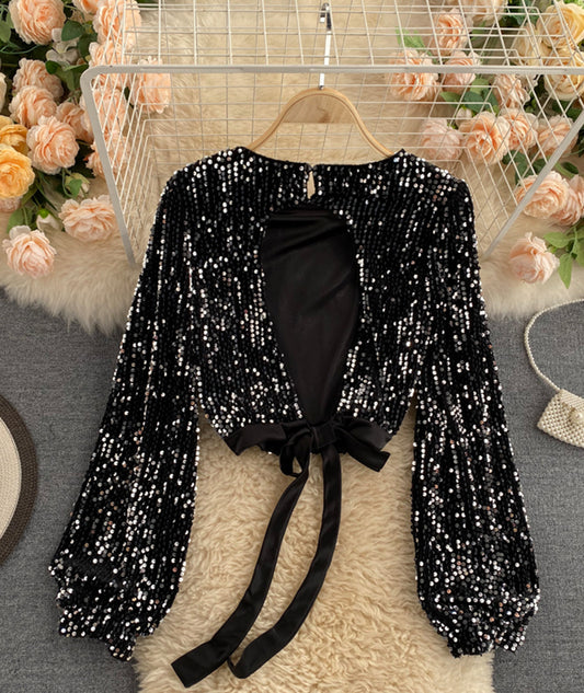 Shiny Long Sleeve Sequins Tops Open Back Tops S4392