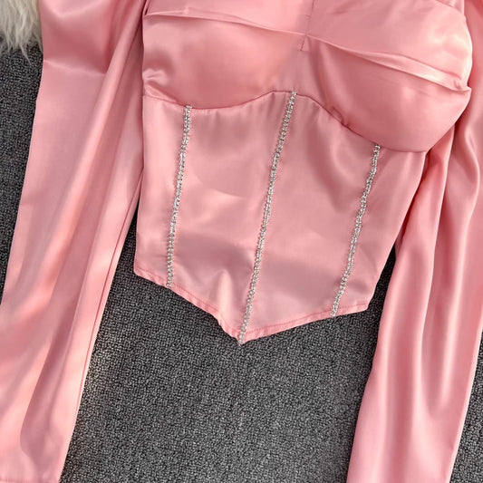 Square Neck Long Sleeve Diamond Waist Women’s Fashionable Short Top S4242