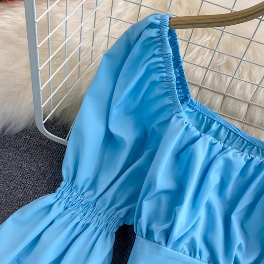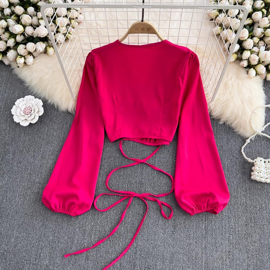 Deep V Neck Puff Sleeve Shirt Women's Fashionable and Chic Short Top S4225