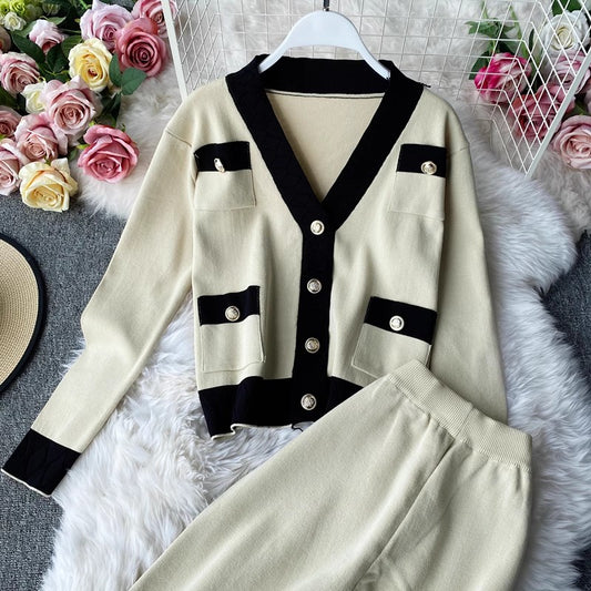 Knitted suit for women casual V-neck cardigan sweater casual leg trousers two-piece set S4169