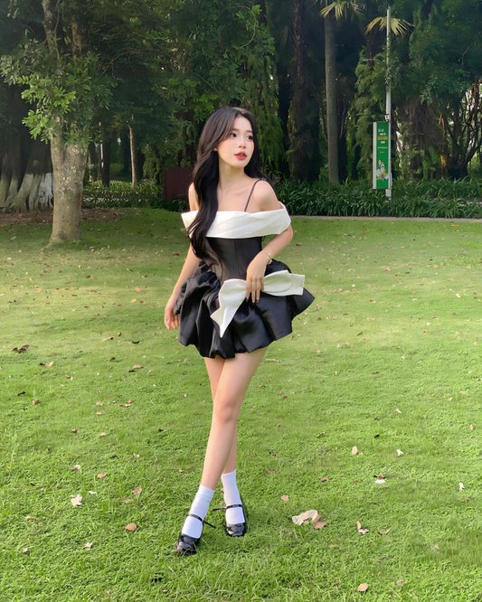 Black short skirt with white neckline, one shoulder, slim waist, A-line short skirt, homecoming dress R4171