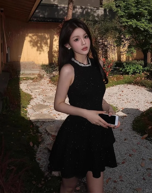 Black sleeveless vest dress with unique temperament and waist A-line puffy skirt R0556