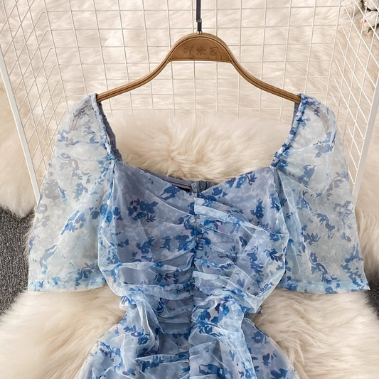 floral skirt new square neck puff sleeve pleated dress for women S4287