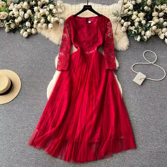 French retro lace dress for women long skirt S4623