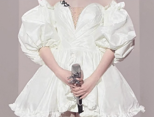 French retro one shoulder white V-neck studded bubble sleeve dress, fluffy dress, homecoming dress R2985