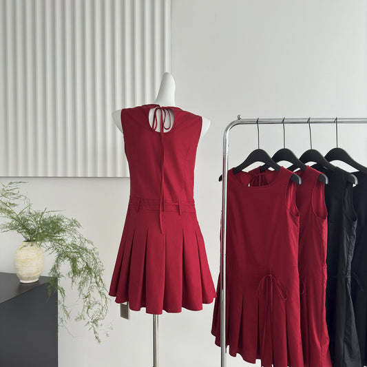 French retro little red dress with hollow back and tie-up pleated sleeveless vest dress R0037