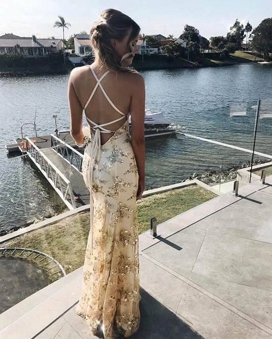 Gold Sequin Mermaid Backless V-Neck Prom Dresses S3255
