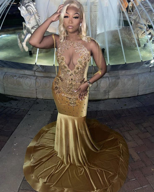 Gold Velvet Sleeveless Mermaid Long Court Train Prom Dresses Mermaid Party Dress S6412