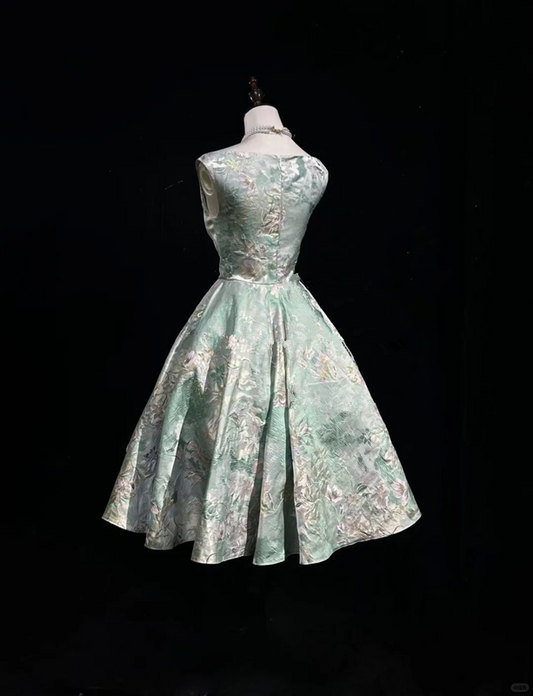 Green printed sleeveless slim waist puffy A-line princess dress homecoming dress R4961