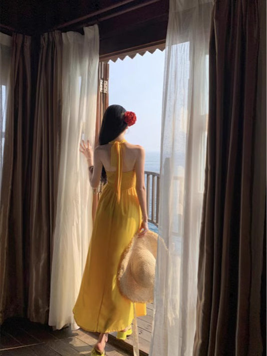 A sense of gold suspender dress, high-end exquisite satin hip-covering dress, French waist-length skirt R0475