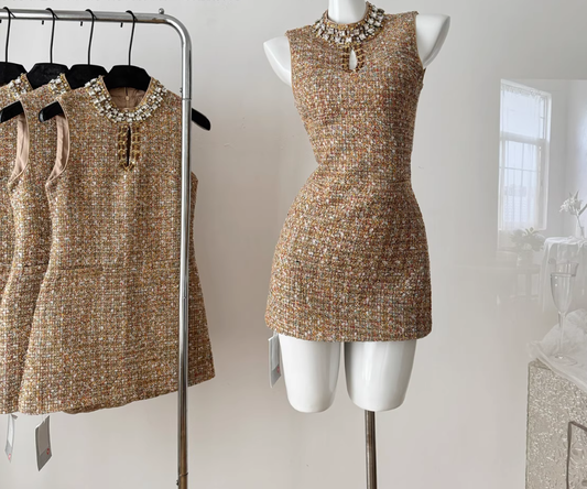 Heavily diamond-studded Chanel-style beaded waisted sleeveless dress R2094
