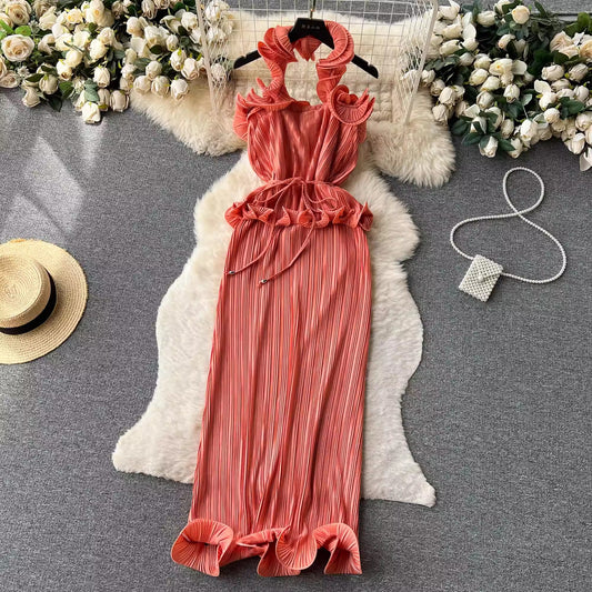 halter neck suspender dress women's pleated holiday dress banquet dress S4625