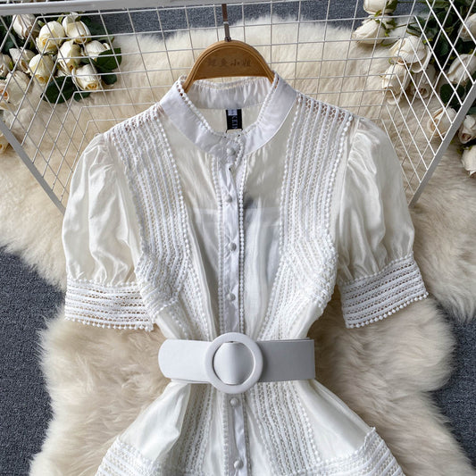 Lace Puff Sleeves Stitching Lace A-line Dress With Belt S4472