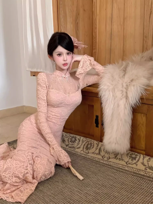 New Chinese style long-sleeved hollow lace dress 2025 step by step lotus hip fishtail skirt R1218