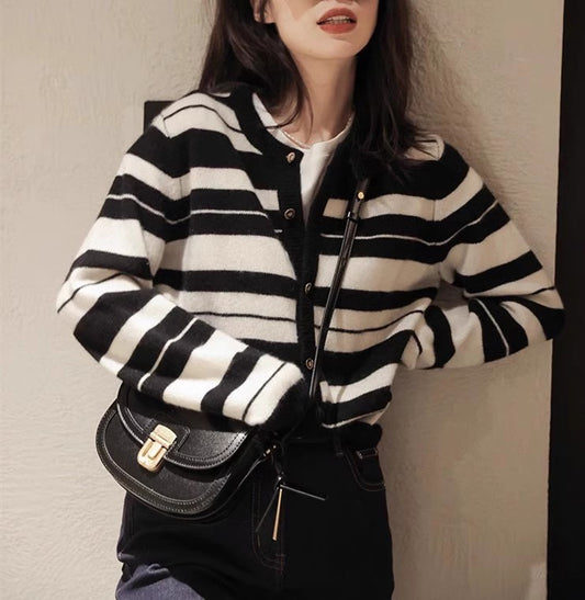 New soft knitted cardigan for women fashionable black top striped Korean style simple sweater jacket S3392
